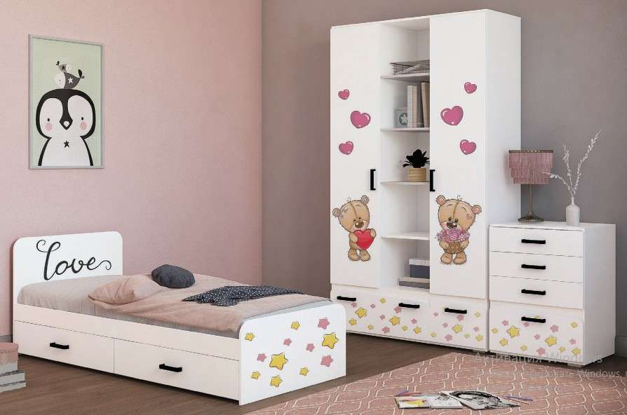 Детская «Акварель-4» с красивой фотопечатью на фасадах, отличается мягкостью, теплотой, особым уютом, что очень актуально для интерьера комнат для маленьких и подростков.