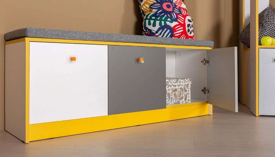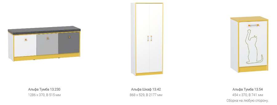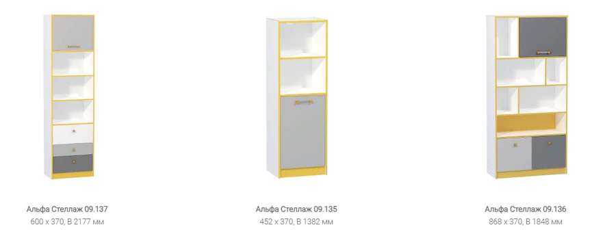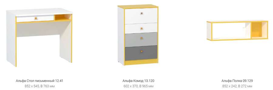 Многофункциональная модульная система Альфа для детской комнаты выполнена в модном сочетании монохрома и ярких, цветных, графичных линий. Особый акцент ставят прозрачные ручки с цветным основанием софт-тач. Коллекция изготавливается в двух цветовых решениях: жизнерадостный «солнечный свет» или свежий «зеленый лайм», можно создавать комбинации в одном цветовом решении или сочетать модули разных цветов между собой.