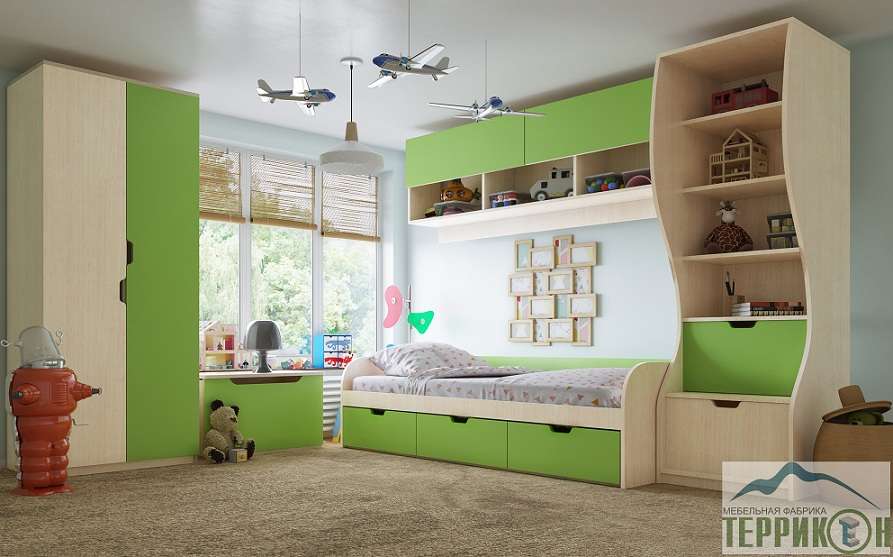 Цена указана за комплектацию на первой фото: Кровать 2,0м №3 , Спальное место : 800х2000, Тумба для игрушек №13, Шкаф №8, Навесная секция №5, Пенал с фрезеровкой №11.