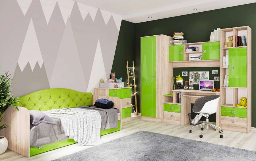 В детской Колибри вы можете подобрать любые модули, подходящие для оформления детской комнаты. Все кровати можно дополнить удобной мягкой спинкой СП-16, сочетающейся с цветом фасадов.