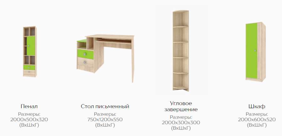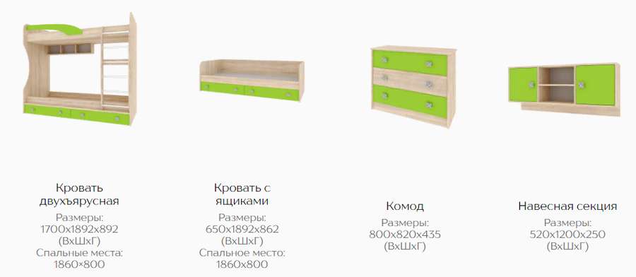Модули, входящие в детскую и их стоимость: ВхШхГ.