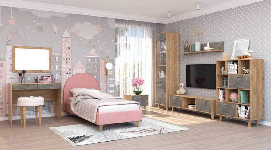 Цена на сайте указана за комплект на первой фото : Пенал ПС-1, Комод К-1, Тумба Т-3, Кровать мягкая арт. 014, Тумба Т-5, стол СТ-1,Зеркало, Полка ПЛ-2 .