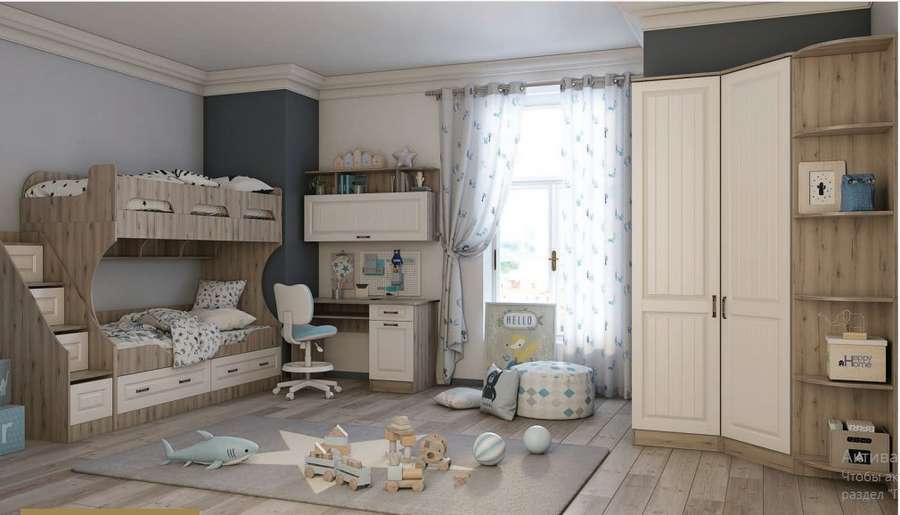 Несмотря на аскетичный дизайн, детская «Кантри» смотрится нарядно и престижно. Добиться такого эффекта позволяет светлая отделка корпуса и фасада. Сочетание оттенков роялвуд и дуб серый выглядит привлекательно и идеально гармонирует с интерьерами, оформленными в самых разных цветовых гаммах. Комплект одинаково хорошо подходит к обстановкам в классическом, деревенском и скандинавском стилях.