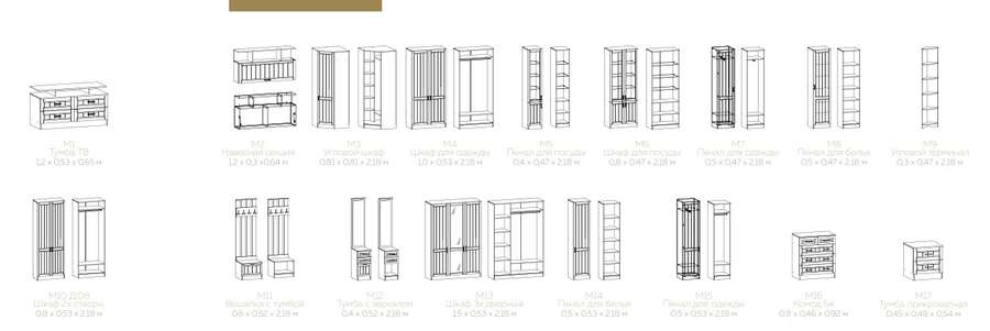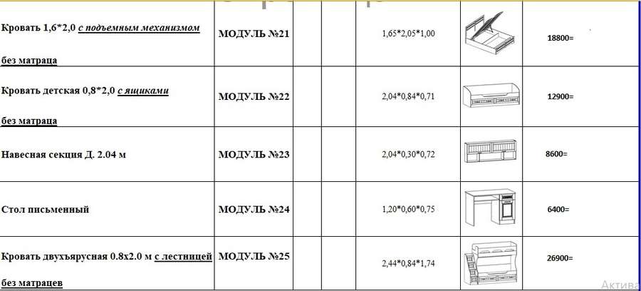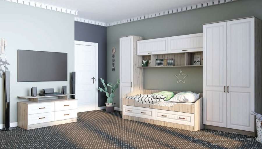 В комплект на фото входят: Тумба ТВ М1, Пенал для белья М8, Кровать М22, Навесная секция М23, Шкаф 2-х ств. М10.