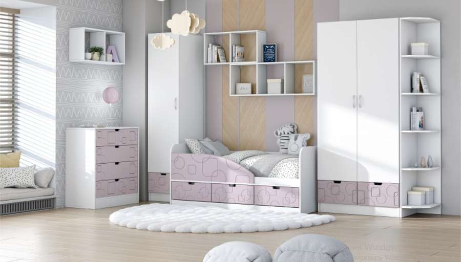 Цвет: Фасады серии детской мебели «БРИЗ» выполнены в трех цветах: Сирень, Ирис, Антарктида Корпус выполнен в Белом цвете. Фрезеровка Волна и Квадрат.