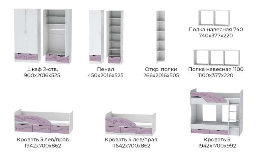 Стоимость на сайте указана за комплект на первой фото в цвете Ирис: Пенал, Кровать Бриз-4, Шкаф 2-х створчатый платяной с выдвижными ящиками, Открытые полки (Угол), Комод, Две полки 740 и Одна полка 1100.