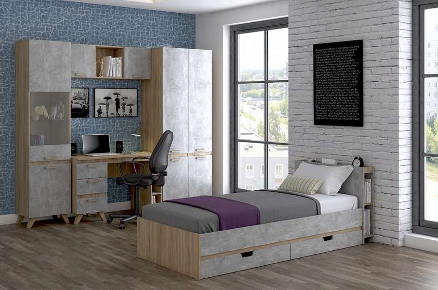 Цена на сайте указана за комплект на фото: Комплект выдвижных ящиков для кровати , Кровать без выдвижных ящиков , Пенал 1-ств. со стеклом , Полка навесная с дверцами, Стол письменный, Шкаф 2-х ств.