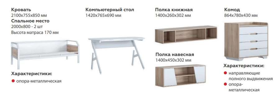 Цена на сайте указана за комплект на первой фото: Пенал, Стол компьютерный, полка навесная, Кровать 2-х ярусная, Шкаф универсальный, Пенал книжный.