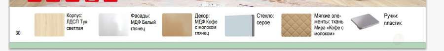 - Цвет корпуса: Туя светлая. Фасад-МДФ белый глянец.Декор -МДФ Кофе с молоком глянец,Мягкие элементы-ткань Мира кофе смолоком.