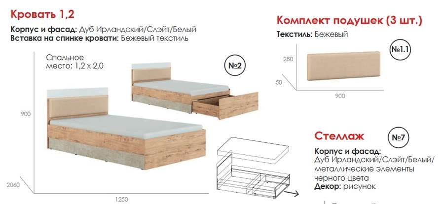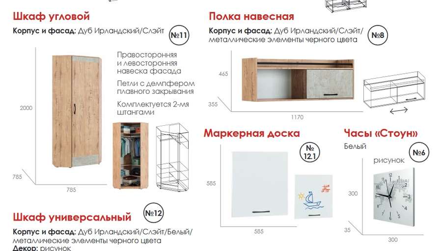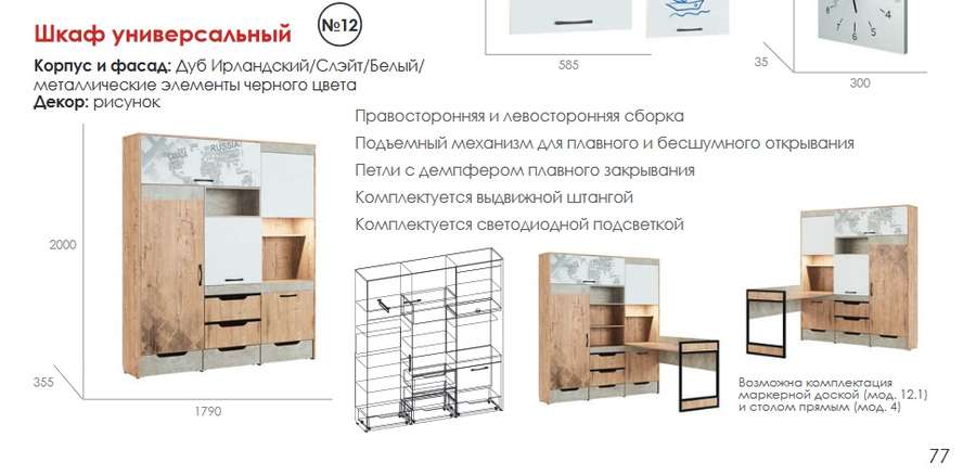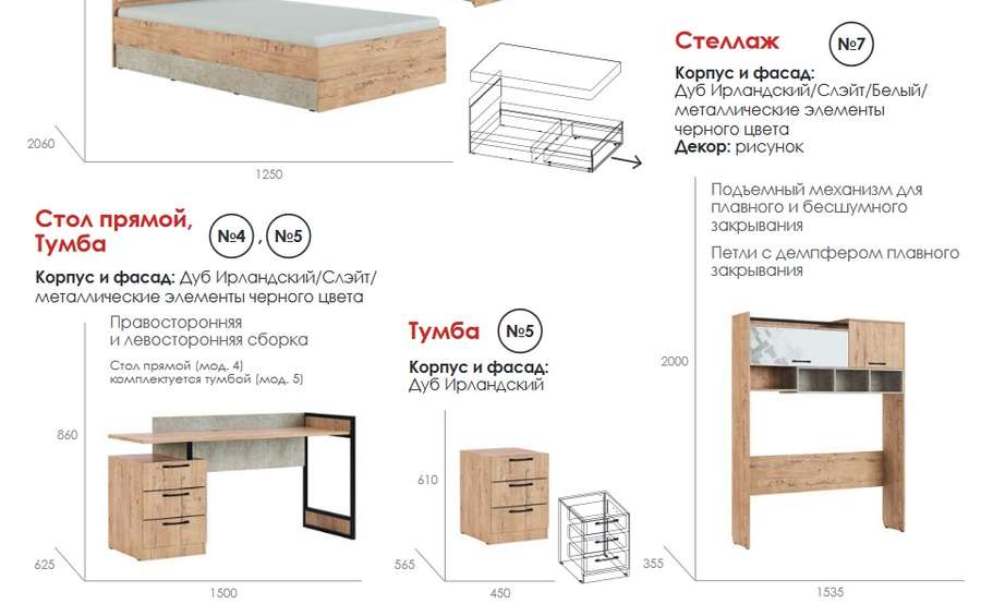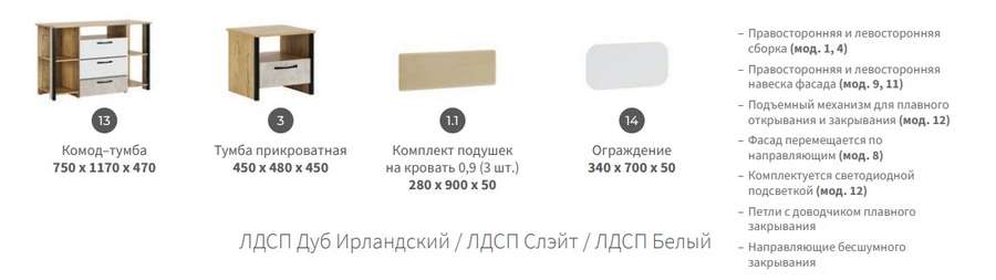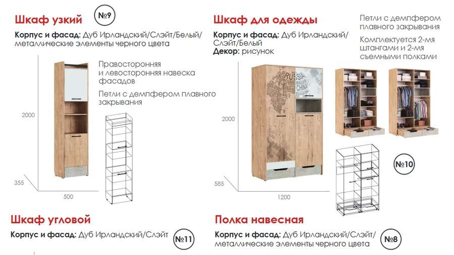 - Цвет: Корпус и фасад: Дуб Ирландский/Слэйт/Белый/металлические элементы черного цвета.