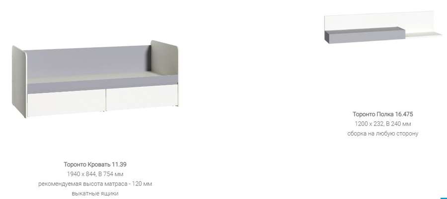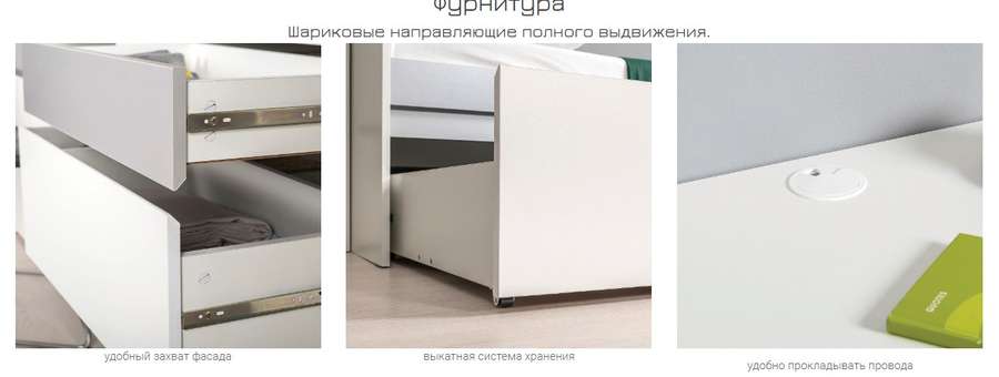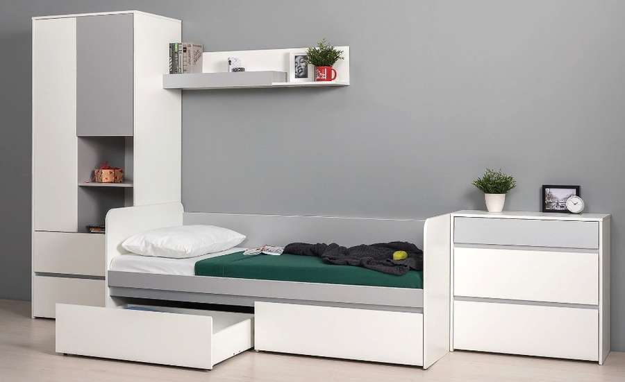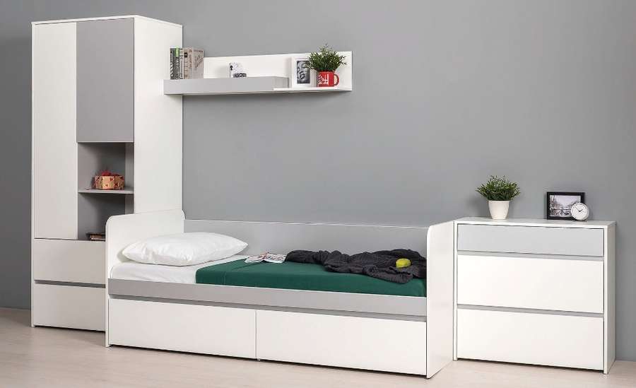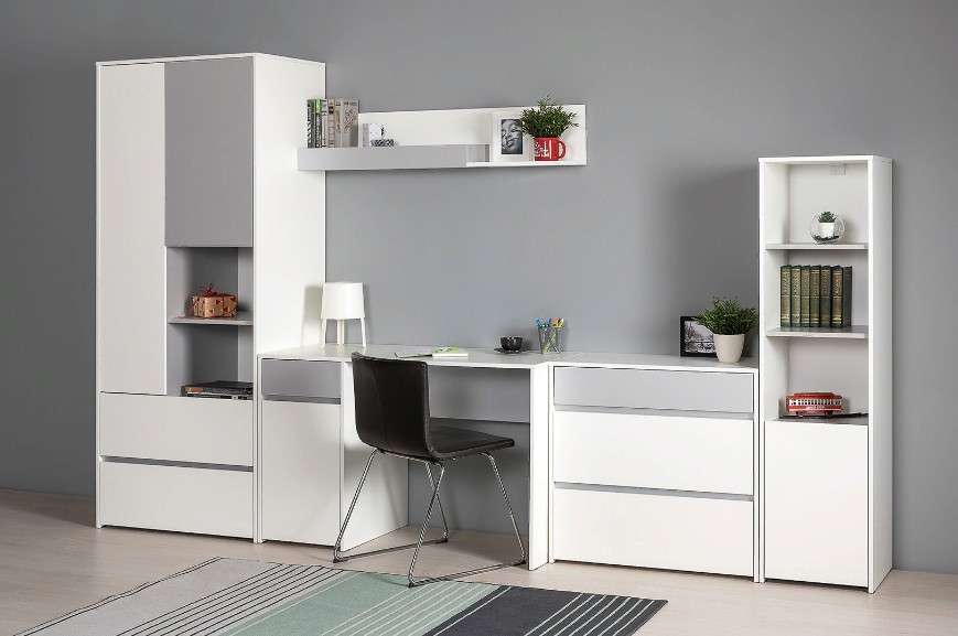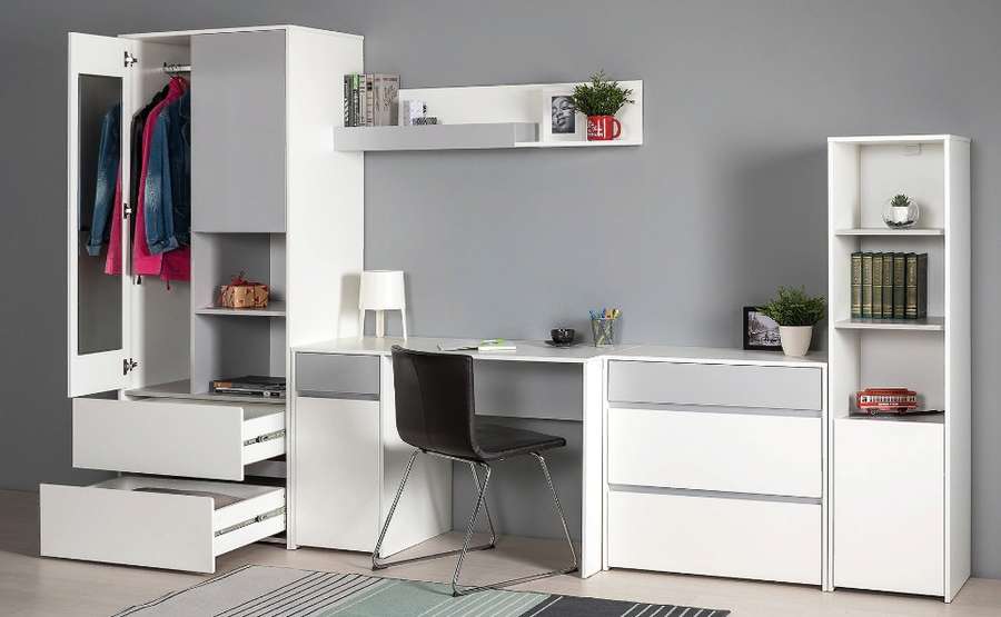 Стильная и актуальная мебель для молодёжной комнаты. Базовый белый цвет, сочетаясь с акцентным серым, создаёт нейтральную основу интерьера, чтобы подчеркнуть личные вещи и аксессуары. Отсутствие лицевой фурнитуры и открывание фасадов за край - не только стилевое, но функциональное решение. Так мебель занимает меньше места и дает возможность проходить вплотную с фасадом без риска зацепиться за ручку или травмироваться.