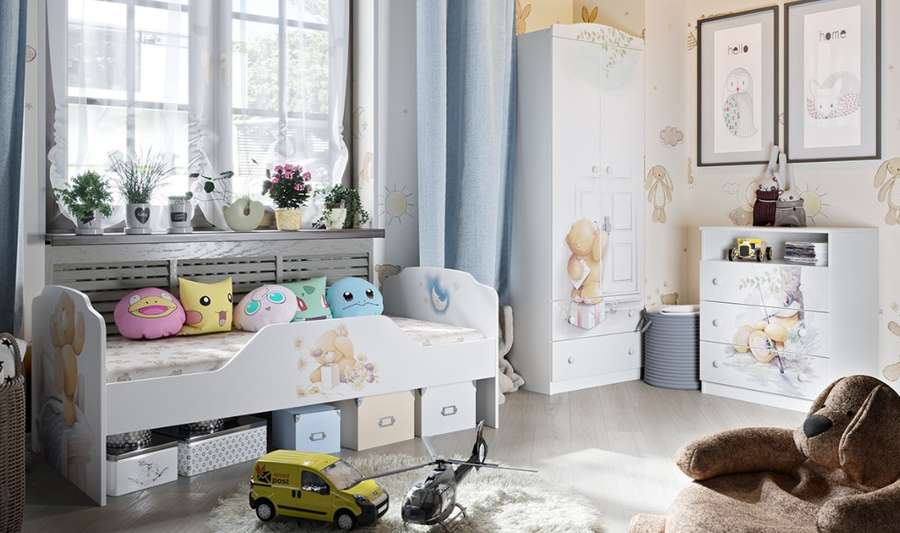 Интерьер детской, обустроенный с помощью нашей новой мебели «Тедди», будет отличаться не только удобством, безопасностью и комфортом, но и способен будет побудить ребенка к творчеству, поддержать его стремления, увлечения. Оформление этого набора выполнено в пастельных тонах неспроста. От атмосферы, окружающей ребенка, требуется только расслабляющий спокойный настрой. Но и акценты в окружающих предметах необходимы, поэтому на некоторые детали нанесены рисунки. Маленькому жителю комнаты это поможет фокусировать зрение. Он будет разглядывать рисунки, мелкие детали.