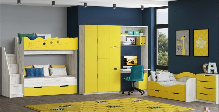 Цена на сайте указана за Кровать 2-х ярусная, Шкаф №1, Стол-Рабочая зона, Комод , Кровать №1 размер 1,6м в цвете Лимон матовый.