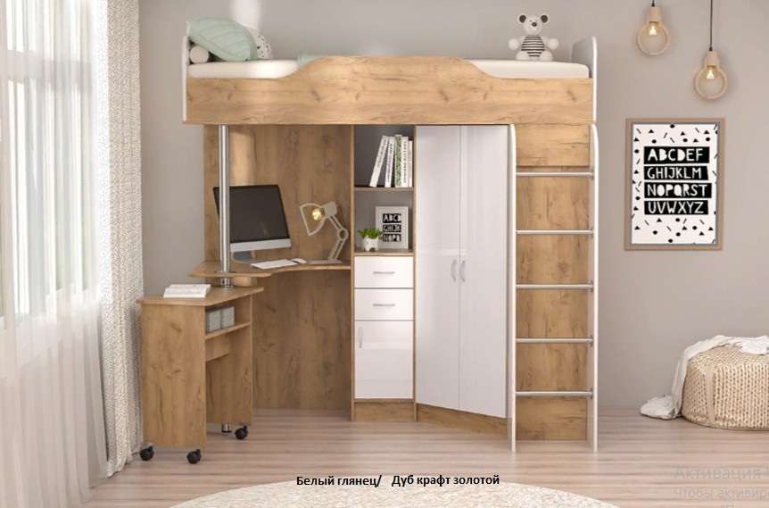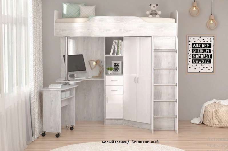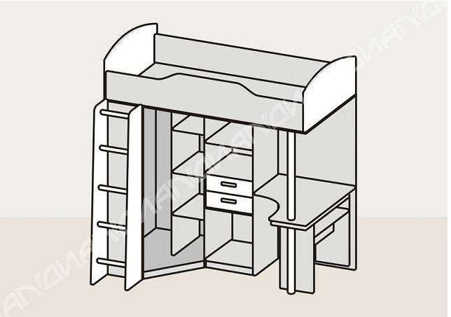 - В комплект входит: кровать со спальным местом 80х190, внизу которого расположены вместительный угловой шкаф (полки+штанга), стеллаж для книг и компьютерный стол с дополнительным выкатным столиком.