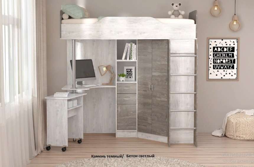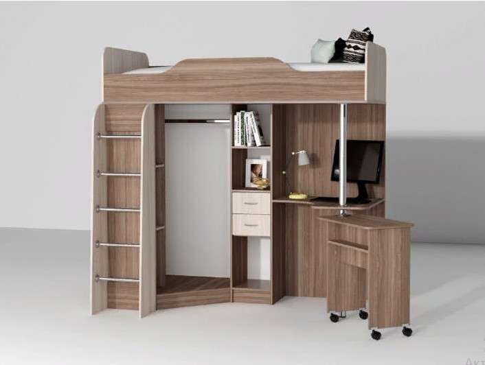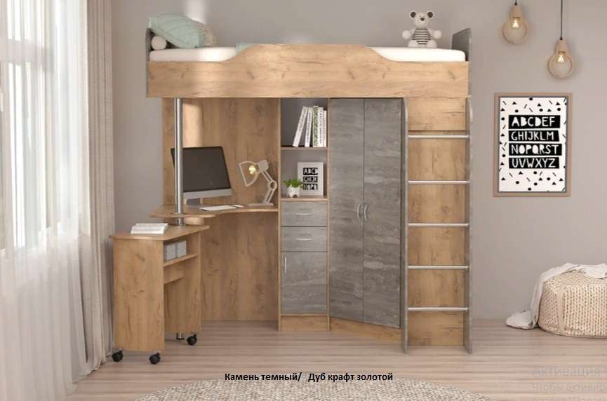 - В комплект входит: кровать со спальным местом 80х190, внизу которого расположены вместительный угловой шкаф (полки+штанга), стеллаж для книг и компьютерный стол с дополнительным выкатным столиком.