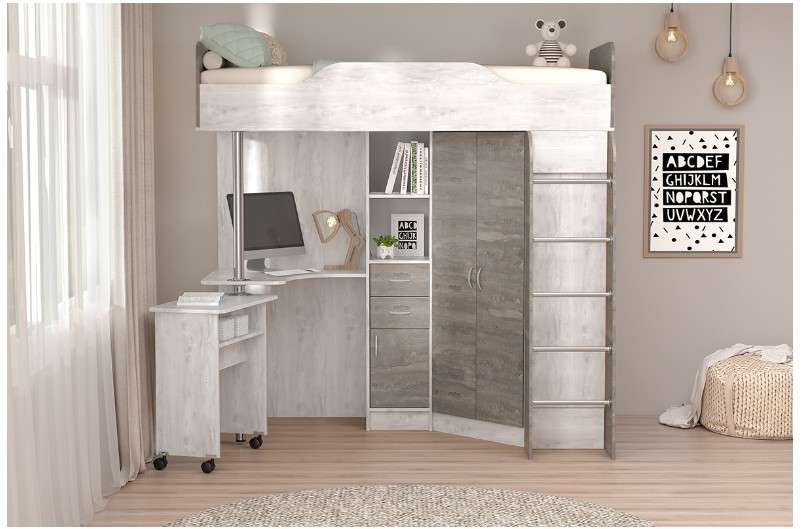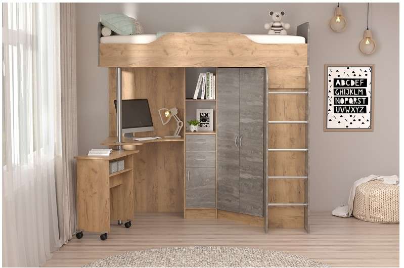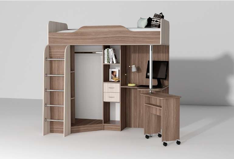 Спальное место в ней располагается на "втором" ярусе, а первый отводится под размещение рабочей зоны с дополнительным выкатным столом и систем хранения: вместительного углового шкафа (полки, штанга) и пенала с закрытыми ящиками и полками.