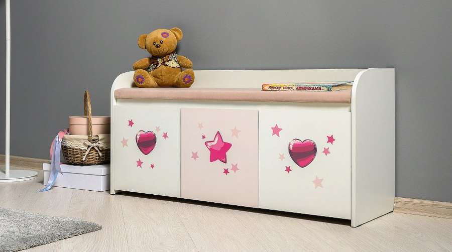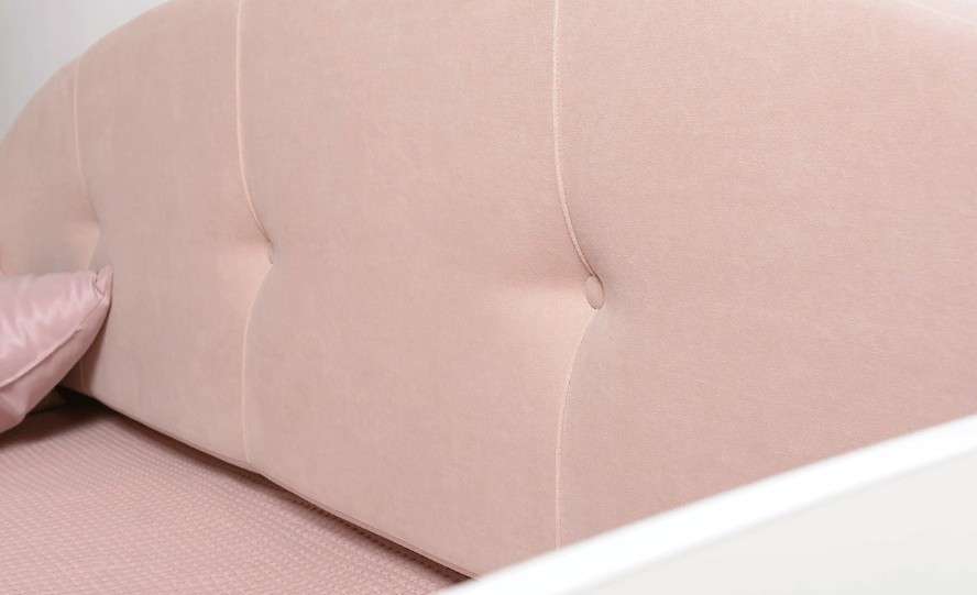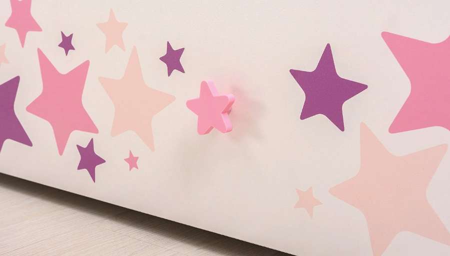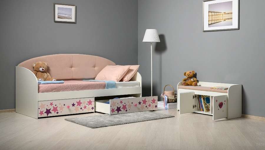 Россыпь разноцветных звёзд - основной мотив новой детской кровати. Лаконичная мягкая спинка с велюровой тканью, пуговицами и втяжками позволяет использовать кровать в качестве дивана. Боковины кровати безопасно скруглены и закрыты прочной 2мм кромкой. Мягкие резиновые ручки в форме цветных звёздочек приятны на ощупь и совершенно безопасны.
