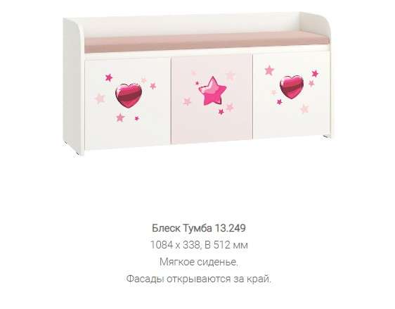Тумба «БЛЕСК» 13.249, Размер : 1084х338х512 мм, (ШхГхВ). Мягкое сиденье, дверки открываются за край. Стоимость тумбы- 4800 руб.