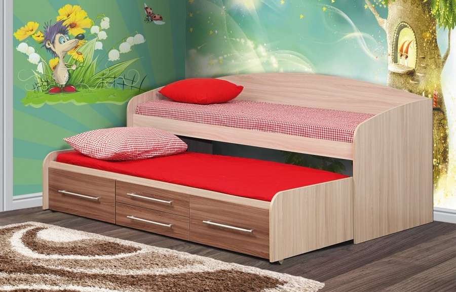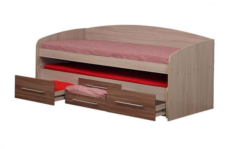 Двухъярусная детская кровать «Адель-5» имеет весьма необычную компоновку. У неё выдвижное нижнее спальное место, благодаря чему общая высота кровати составляет всего 66 см. Нижний блок оснащён двумя парами больших и малых выдвижных ящиков для постельных принадлежностей, а также колёсиками, поэтому для его выдвигания вам не потребуется значительных усилий. Размеры спальных мест отличаются. Кровать оборудована боковинами и задней спинкой.