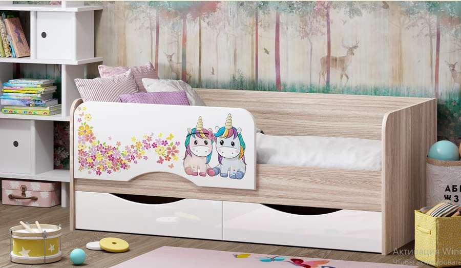 Очень красивая кровать со сказочными персонажами на фасаде, доставит радость вашему ребенку,имеет два выдвижных ящика.