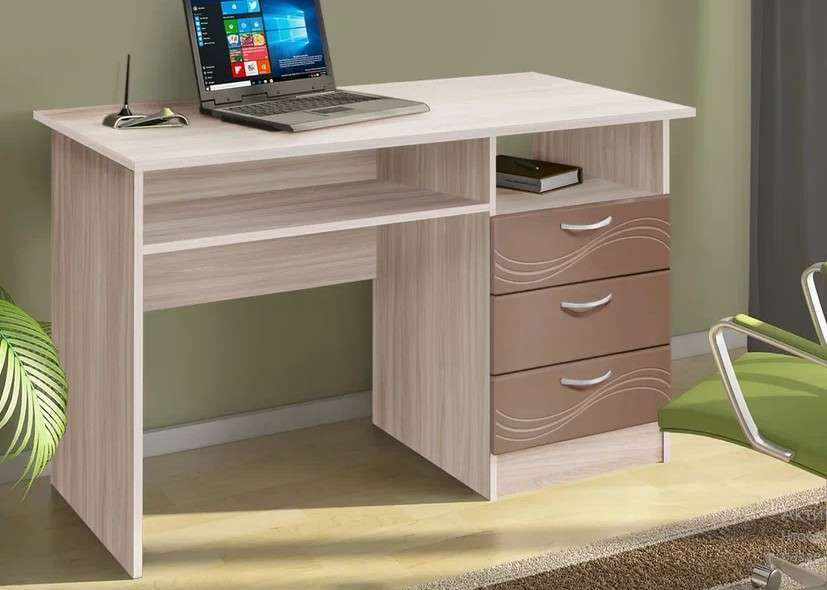 Рабочая поверхность стола достаточного размера для того, чтобы разместить монитор и прочие принадлежности для учёбы и занятий творчеством, есть открытые ниши и три вместительных ящика для хранения.