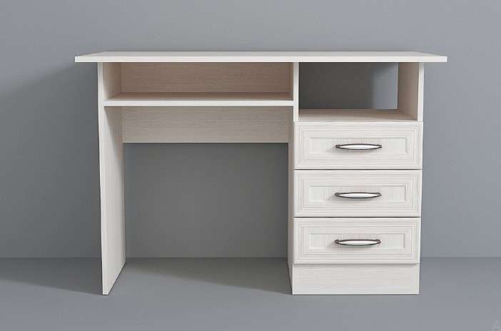 Рабочая поверхность стола достаточного размера для того, чтобы разместить монитор и прочие принадлежности для учёбы и занятий творчеством, есть открытые ниши и три вместительных ящика для хранения.