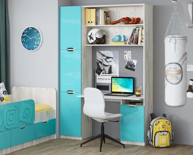 Рабочая зона «Юниор-15» - превосходный выбор для детской комнаты Вашего ребенка. Идеальный вариант для школьников, включающий в себя функционал шкафа и письменного стола. К нему можно подобрать из этой серии и шкафы и комоды и кроватки.