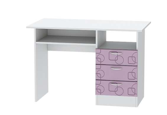 Рабочая поверхность стола достаточного размера для того, чтобы разместить монитор и прочие принадлежности для учёбы и занятий творчеством, есть открытые ниши и три вместительных ящика для хранения.