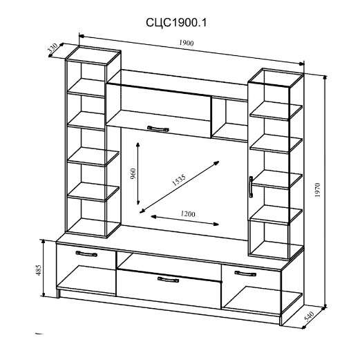 Габаритные размеры: Высота: 1970 мм / Ширина: 1900 мм / Глубина: 540 мм.