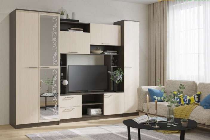 Ассиметричное расположение верхних закрытых полок вносит оригинальность в общую композицию гостиной ФЛОРА.