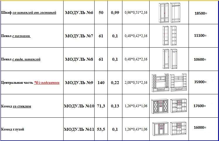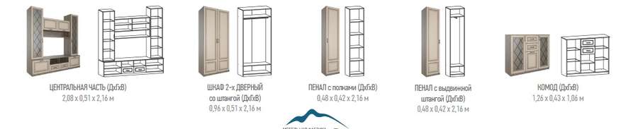 На сайте указана стоимость гостиной на фото. В гостиную на фото входят : Центральная част М9,Пенал с полками М7 и Пенал с выдвижной штангой М8. Размер гостиной: 3040х510х2160 мм, (ШхГхВ).