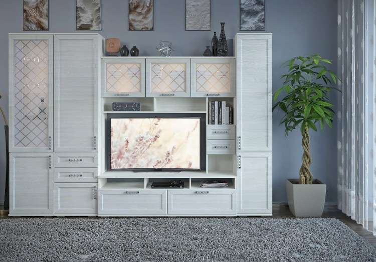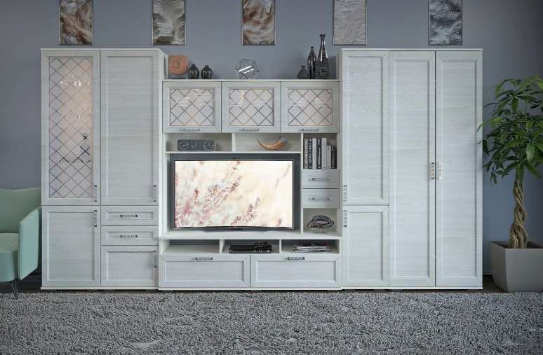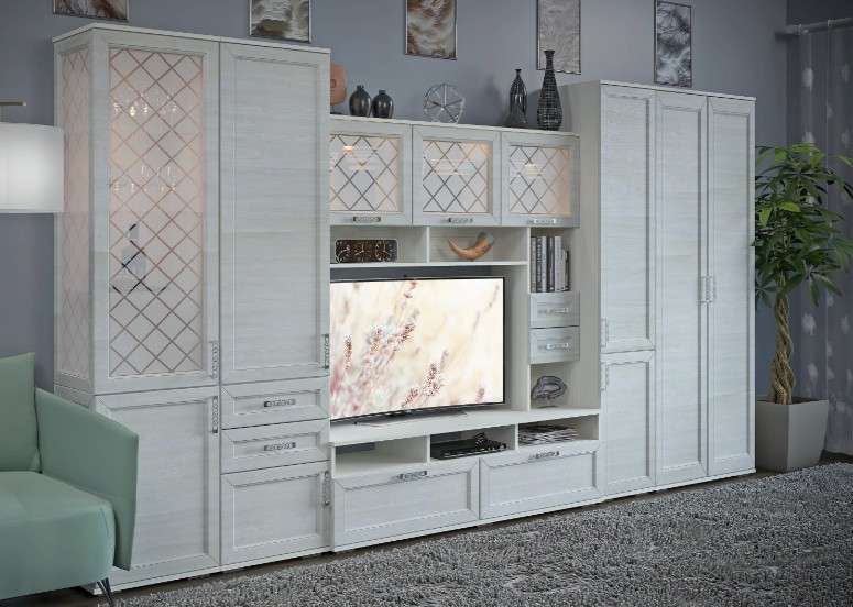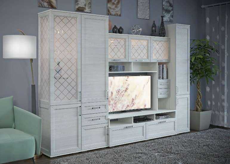 Цена на сайте указана за гостиную на первой фото: Шкаф-витрина, Шкаф-пенал, Тумба под ТВ, Пенал. Размер всей гостиной: 2950х450х2070мм, (ШхГхВ).