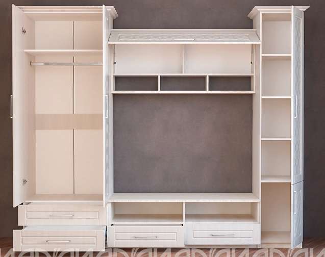 Комплект включает в себя: просторный шкаф для одежды с антресольной полкой, металлической штангой и двумя вместительными ящиками, пенал-витрину с матовым стеклом и закрытой нишей, тумбу под телевизор с ящиками и нишами, центральную закрытую секцию и открытые полки.
