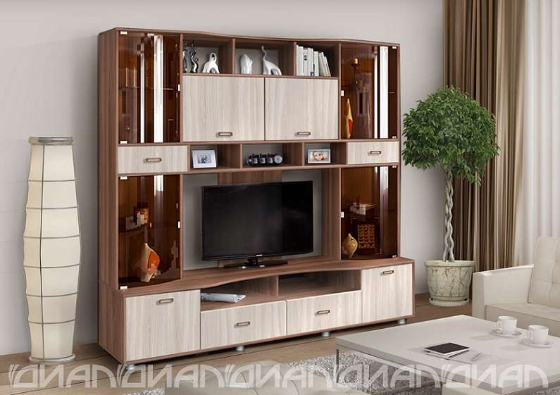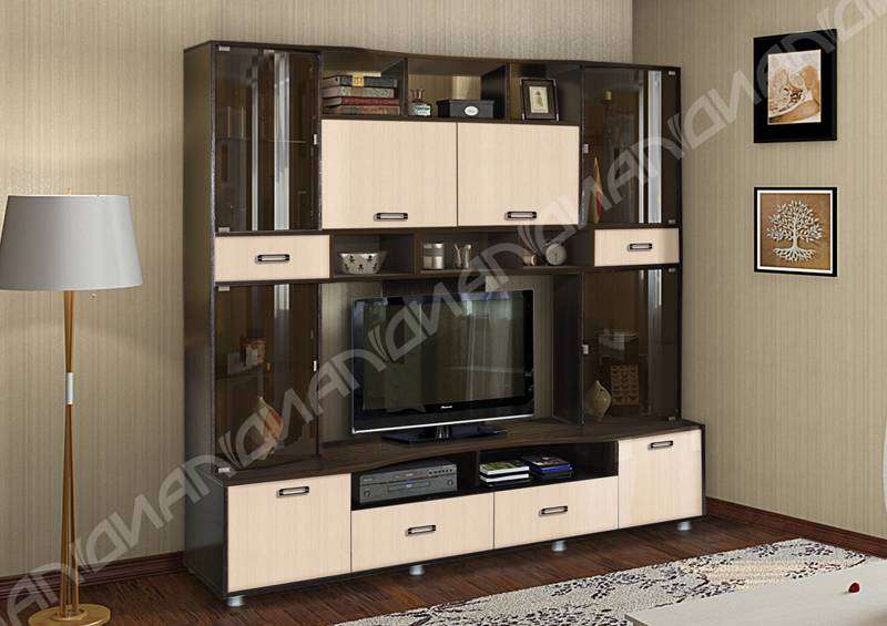 Стенка с легкостью впишется в интерьер любой квартиры, благодаря витринам с гнутым стеклом, укомплектованными выдвижными ящиками, тумбе под телевизор с ящиками и нишей, открытым полкам для сувениров и книг.