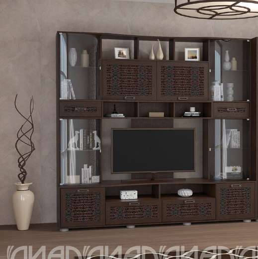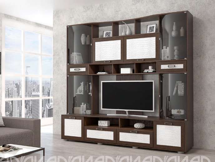 Комплект включает в себя: шкафы-витрины с гнутым стеклом, укомплектованные выдвижными ящиками; тумбу под телевизор с ящиками и нишами; открытые полки, что позволит комфортно расположить технику, красивую посуду, сувениры, книги и другие необходимые в быту вещи.