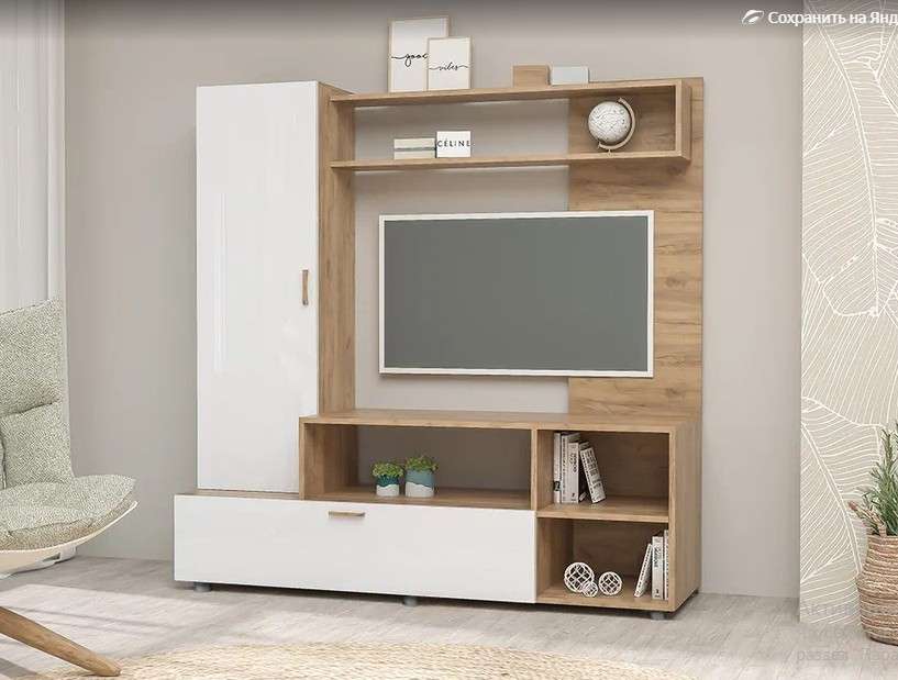 Компактная стенка для гостиной с большой нишей под телевизор, с пеналом и открытыми полками для книг.