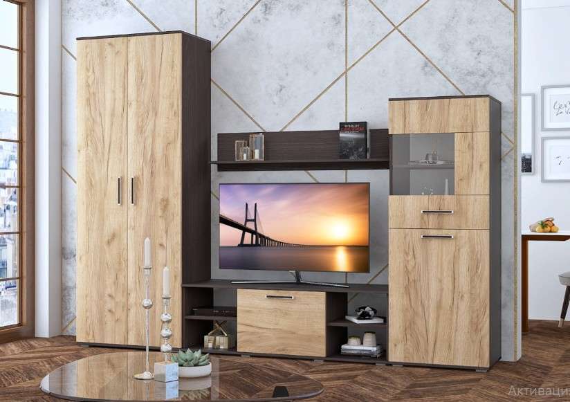 На сайте указана стоимость гостиной на первой фото: Витрина малая, Витрина большая, Полка навесная, Тумба ТВ.