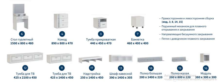 «Белла» - элегантная, практичная и функциональная гостиная в традиционном стиле. Светлая цветовая гамма в сочетании с пескоструйным узором на зеркалах, стеклом мателюкс и патиной добавят в интерьер изысканность и легкость, наполнив комнату светом.