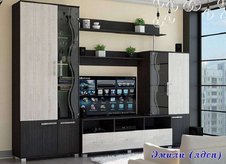Тем, кто ценит минимализм и функциональность, стоит обратить внимание на гостиную «Эмили». Дизайн гарнитура прост, но примечателен. Поверхности из ламинированной ДСП смотрятся также красиво и натурально, как массив дорогих сортов дерева. Стеклянные дверцы шкафчиков придают мебели утонченный вид. Комплект включает в себя все важные предметы: нишу для телевизора, шкафы, полки, выдвижные ящики.