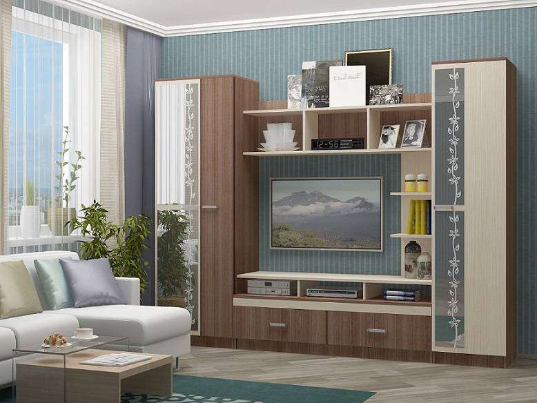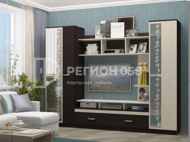 Это классическая стенка с двумя распашными шкафами, множеством удобных открытых полок для различных вещей и нишей под ТВ. Эта недорогая и качественная мебель изготовлена из ЛДСП. В состав набора мебели входит распашной двухстворчатый шкаф с вместительными секциями для одежды и белья, отдельные секции для длинной и короткой одежды. Оригинальный пескоструйный рисунок на зеркале создает привлекательный эстетичный стиль мебели.