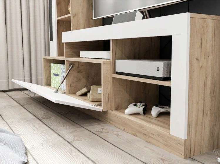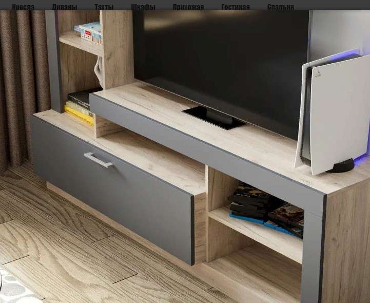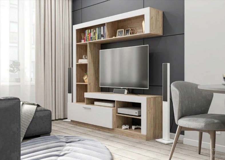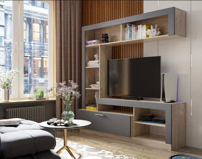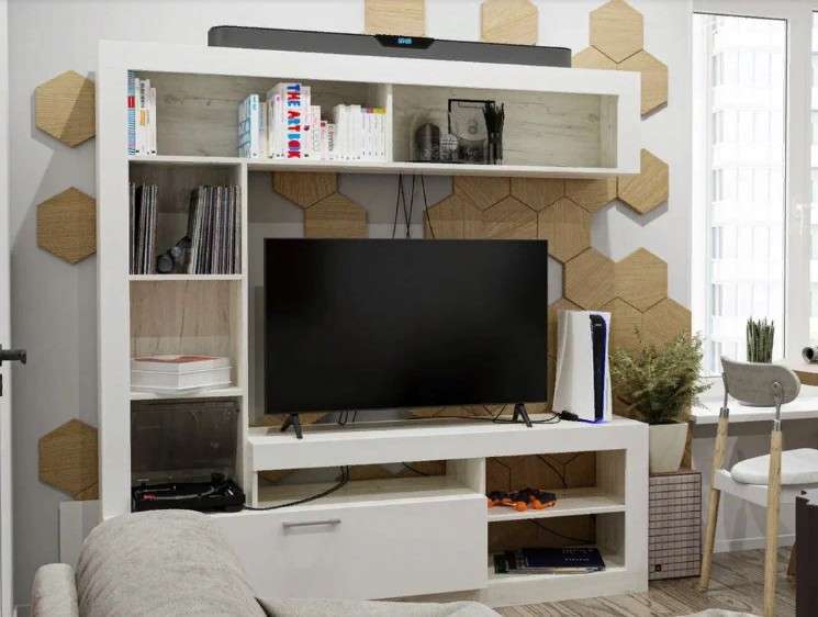 Компактная и лаконичная гостиная Гавана послужит функциональным решением для организации предметов декора и первой необходимости. В центре стенки большая ниша под телевизор. Благодаря современному стилю, данная модель отлично будет смотреться в любых интерьерных решениях. На нижних открытых полках поместятся всё техническое оборудование.