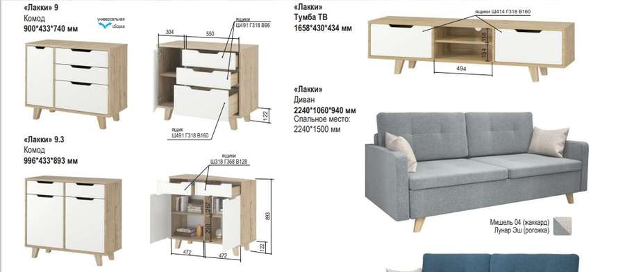 Цена на сайте указана за комплект на фото: «Лакки 9» Комод, «Лакки 8» Шкаф навесной-2шт., «Лакки» Тумба ТВ, «Лакки 9.3 Комод, «Лакки 7» Полка-2шт.