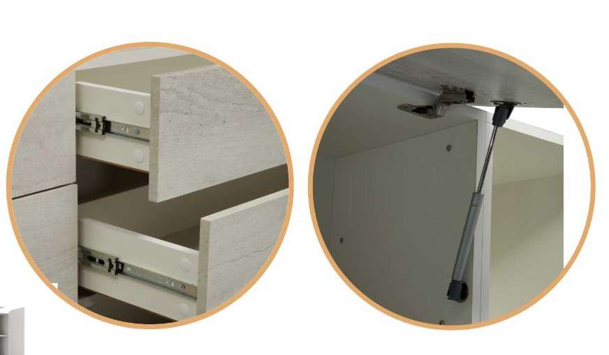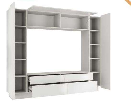 Внизу имеется четыре вместительных выдвижных ящика (комплектуются шариковыми направляющими) и два больших отделения вверху (комплектуются газлифтами) В каждой боковой секции по пять полок. Все дверцы, кроме верхних оснащены толкателями. Цветовые решения в белом и черном глянце придают стенке отличный внешний вид, подходящий для любого оттенка интерьера.