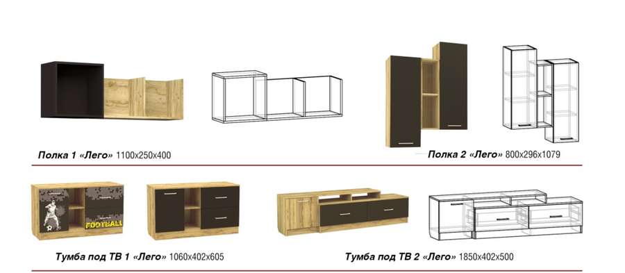 Цена указана за комплект на фото: Тумба, Полка-2, Тумба под ТВ 2, Шкаф напольный (малый).