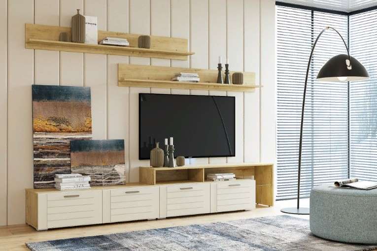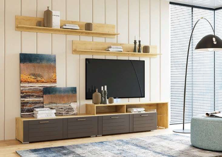 Комплектация №7 из коллекции LIVORNO включает в себя небольшое число модулей, но по функционалу не уступает многим другим наборам из этой серии. В числе ее преимуществ длинные навесные полки. На них можно разместить большое количество предметов декора. Тумбы под телевизор помогут организовать удобную систему хранения для тех вещей, которые хочется скрыть от посторонних глаз.