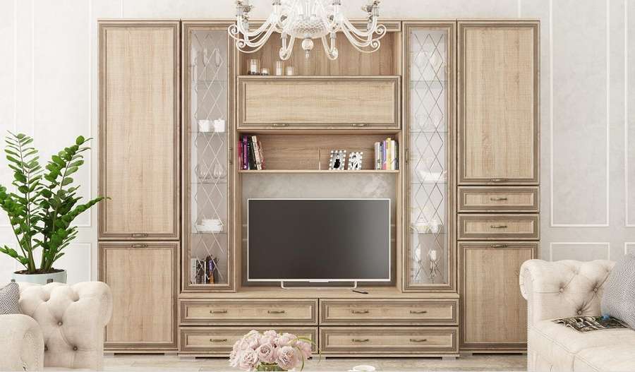 Гостиная ЛИВОРНО выполнена в классическом стиле. Рамочные фасады с объемной 3-D вставкой и благородным эффектом Патины создают атмосферу единства современных технологий и вековых традиций. Изящные ручки цвета «Старая бронза» придают коллекции благородный шарм. Дополняет впечатление высококачественная фурнитура, петли с доводчиками для бесшумного закрывания и шариковые направляющие полного выдвижения. Композиции, созданные из достаточно обширного модульного ряда, легко впишутся в помещение любого размера.