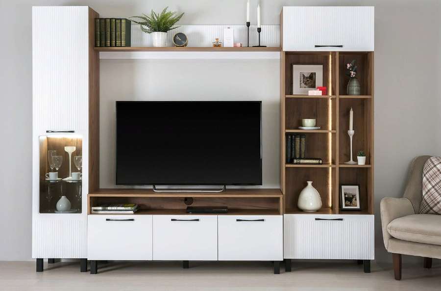Оригинальное и стильное решение для гостиной. Белый глянцевый декор на фасадах прочно