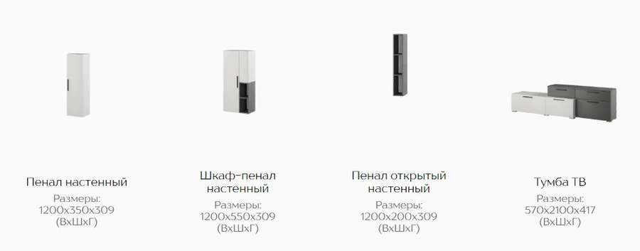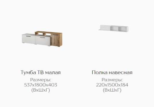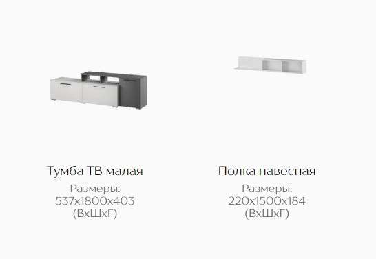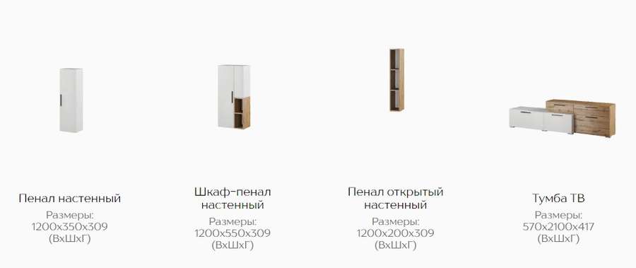 Цена на сайте указана за комплект на первой фото: Пенал настенный, Пенал открытый настенный, Тумба ТВ малая, Полка навесная.