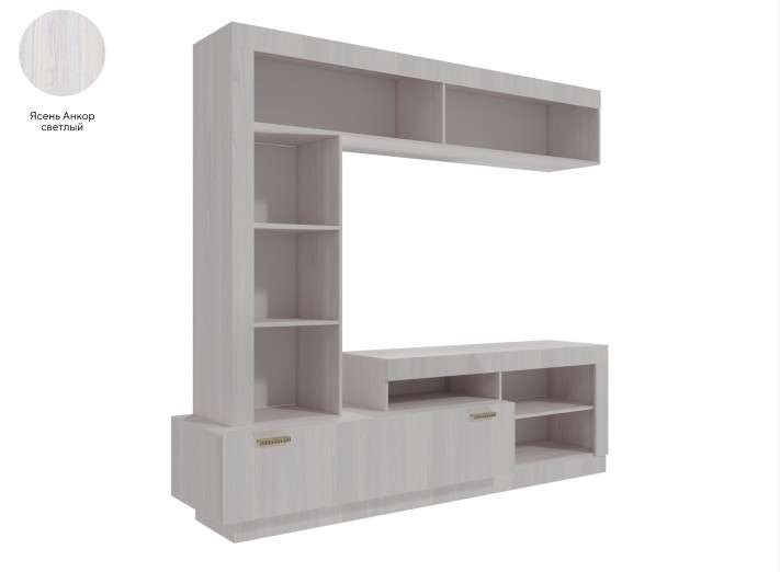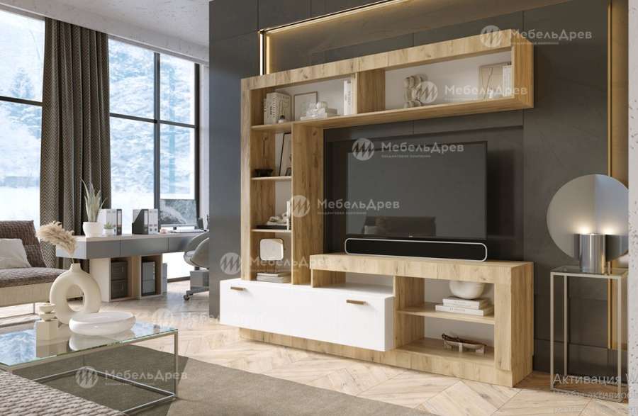 Гостиная «Мускат» - Это выигрышный вариант для стильного интерьера. Необычный асимметричный дизайн привлекает внимание и делает вашу квартиру запоминающейся. Обилие открытых полок создает легкость и воздушность, на них можно создать композиции из книг и декора, которые подчеркнут стиль и уют комнаты. В закрытых секциях удобно хранить все, что создает «визуальный шум» — аппаратура, провода и аксессуары. Свободная от шкафов с правой стороны центральная ниша позволяет вместить телевизор с широкой диагональю для самых уютных семейных вечеров.