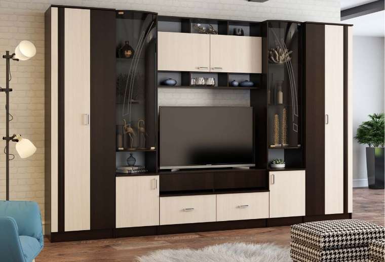 Для удобного хранения большого количества личных вещей идеально подходит гостиная «Муза». Она состоит из вместительных шкафов, полок, ящиков, ниш. Качественна сборка, высококлассные материалы и надежная фурнитура обеспечивают удобство эксплуатации мебели, а также длительный срок ее службы. Элегантный современный дизайн — одно из важнейших достоинств модели.